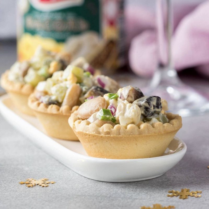 Готовый салат подают в тарталетках или на тарелке, как удобную порцию для быстрого перекуса. Вкус получается насыщенным, но не тяжёлым, и подходит для дневного сезона, когда хочется чего-то знакомого и сытного.