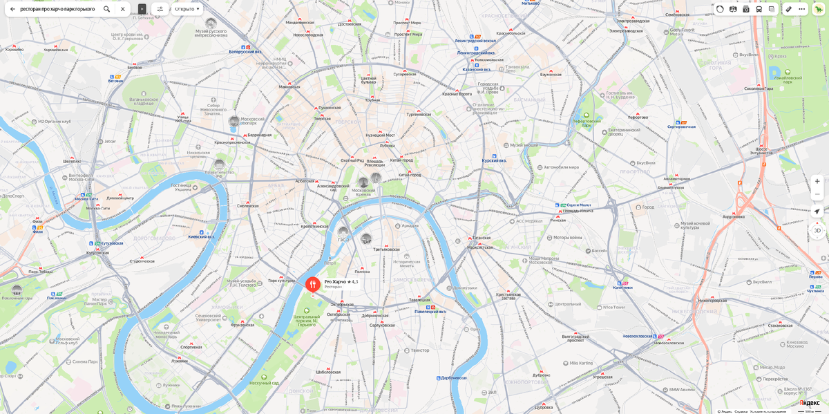 Грузинский ресторан «Про Харчо» расположился в приятной близости от парка Горького, что делает его идеальным местом для посещения после прогулки. Заведение находится в низком дугообразном корпусе, смыкающемся с аркой главного входа в парк.