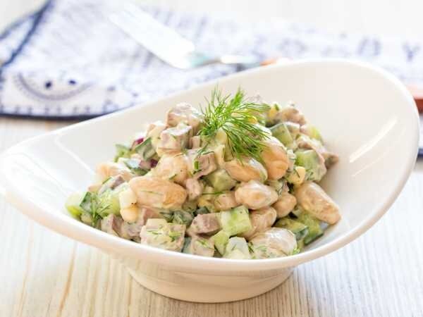 Вкусный салат с языком, огурцом и фасолью для радостного стола