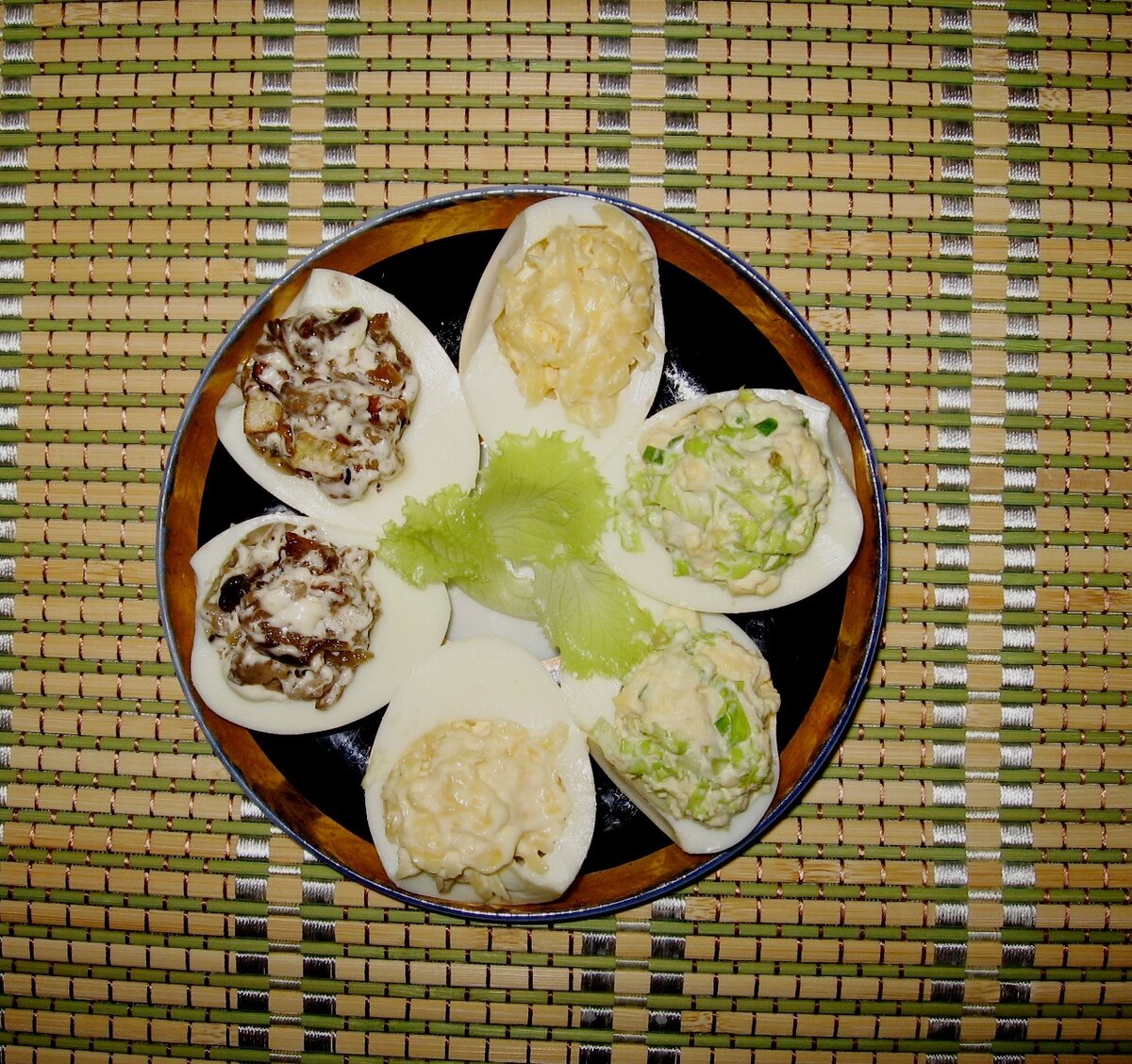 Теперь можно перейти к сборке закуски: половинки яиц выкладываются на сервировочную тарелку и аккуратно начиняются всеми тремя вариантами.
