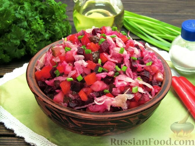 Для любителей сытных блюд подойдет вариация с добавлением слабосоленой сельди и зелёного горошка. Эти ингредиенты придают классическому винегрету новые оттенки вкуса. Необходимы будут: картофель, свекла, морковь, солёные огурцы, репчатый и зелёный лук.