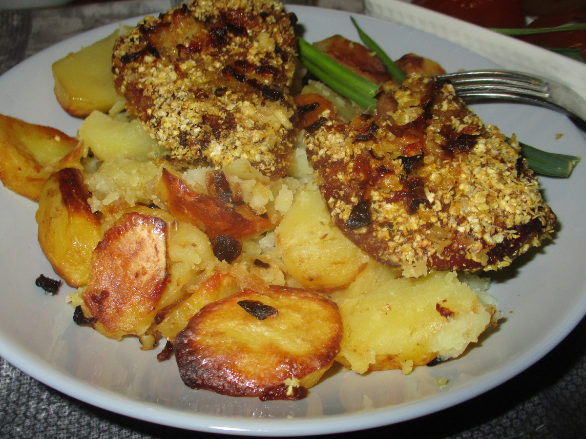 На этот раз в меню - нежная свинина, запеченная с картофелем в рукаве. Мясо предварительно замариновано и обваляно в хрустящих кукурузных хлопьях, что придает блюду особую пикантность и текстуру. Кроме того, в качестве дополнения к основному угощению можно подать маринованные томаты — их свежесть прекрасно перекрикивается с насыщенным вкусом запеканки.