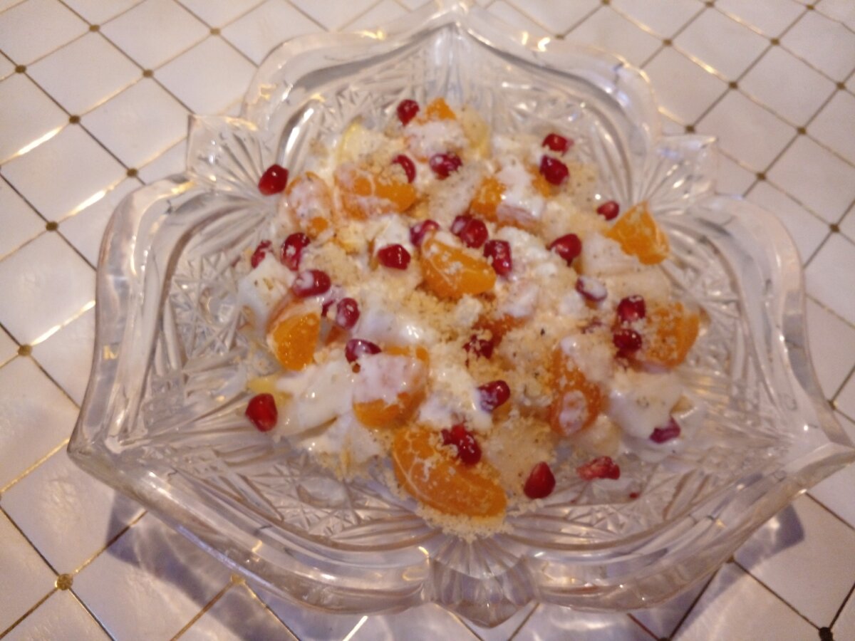 Для подачи порционно можно взять стакан: на его дно положить кусочки яблок и мандаринов, затем посыпать тёртым орехом, добавить грушу, залить йогуртом и украсить зёрнами граната сверху.