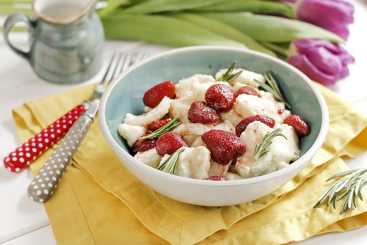 Шаг 3: В отдельной кастрюле смешайте клубнику, оставшийся сахар и листья розмарина. Готовьте на среднем огне 4-5 минут, периодически помешивая. Выложите ньокки на тарелку, добавьте сливочное масло и клубнику. Подавайте немедленно.