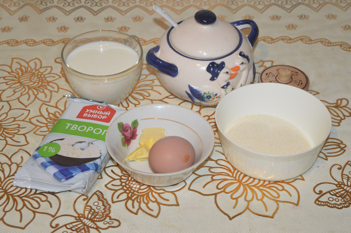 Для начала подготовим все необходимые ингредиенты. В глубокую миску засыпаем манную крупу и заливаем ее молоком. Оставляем массу на некоторое время, чтобы манка набухла. После этого в отдельной тарелке смешиваем творог, яйцо, сахар и щепотку соли. Все тщательно перемешиваем до однородной консистенции.