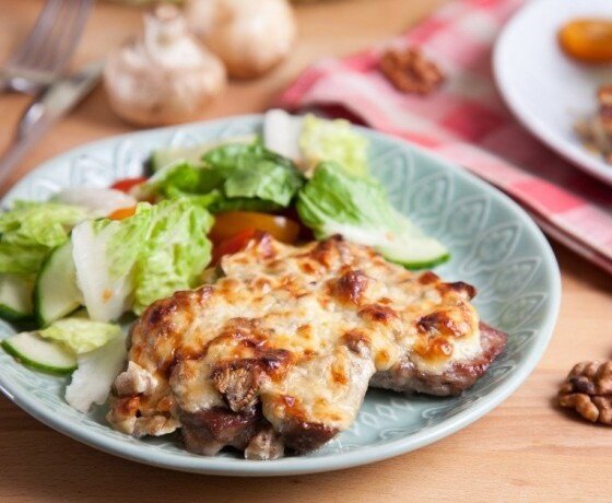 Подготовьте противень, выложив его бумагой для выпечки. На бумагу разместите обжаренные эскалопы, сверху добавьте нарезанные грибы и сырную массу.