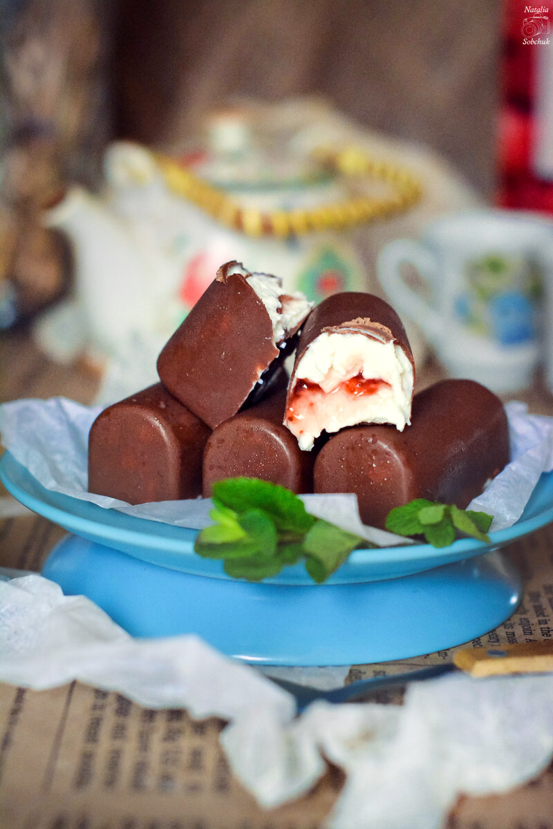 6. Накрыть сырки оставшимся растопленным шоколадом и снова разровнять. Отправить в морозильник на 20 минут или в холодильник на 1-2 часа.