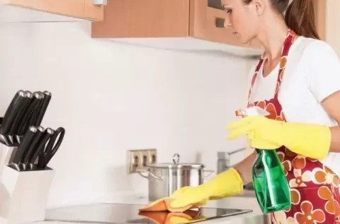 Процесс приготовления спрея довольно прост: смешать равные части уксуса и тёплой воды, добавить каплю моющего средства и тщательно встряхнуть. Наносить раствор нужно на загрязнённые участки, такие как фартук, вытяжка и дверцы шкафчиков. Сделать это лучше на освобождённой поверхности, чтобы не повредить посуду.
