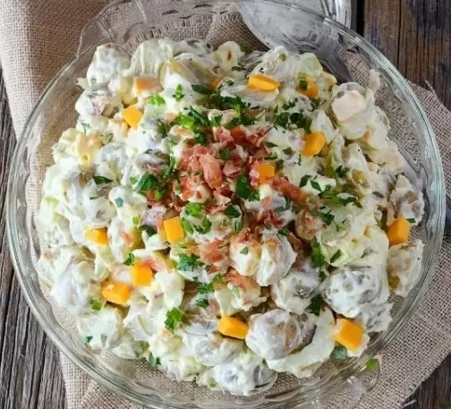 На фоне разнообразия блюд, картофельный салат с добавлением бекона и сыра выделяется особым шармом. Это аппетитное угощение станет великолепным дополнением к любому столу, сочетая в себе элементы простоты и изысканности.