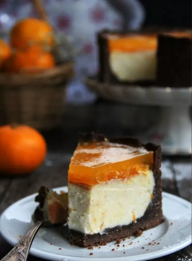 7. Пока чизкейк остывает, почистите мандарины и нарежьте их на кружочки толщиной около 1 см. Из срезанных частей выжмите сок.