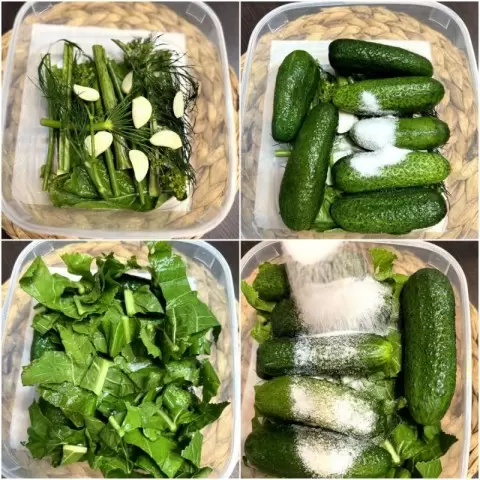 - Нарезать зелень и чеснок, сложить их в пластиковый контейнер с огурцами.