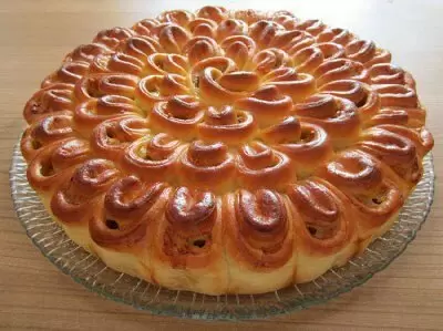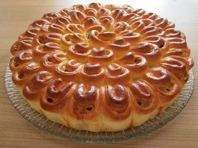 Из оставшейся части теста повторить то же самое. В середине пирога оформить из половинок рулет, который укладывается в центр.