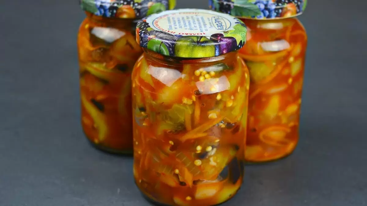Готовую смесь аккуратно разложить по стерилизованным банкам, плотно закрыть крышками и оставить на ночь в перевернутом виде. Через сутки зимняя закуска будет готова к употреблению.