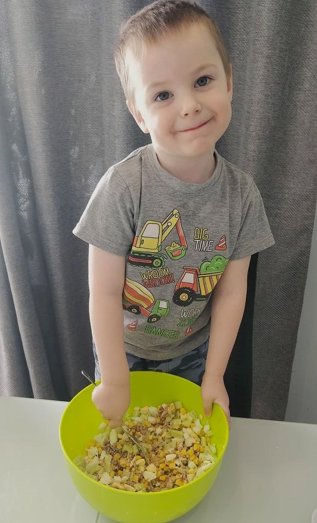 Лёша, маленький помощник на кухне, радостно принялся за готовку вместе с мамой. В этот раз выбор остановился на простом и аппетитном салате с тунцом, который, хоть и не полюбился самому юному шефу, стал настоящим хитом за столом.