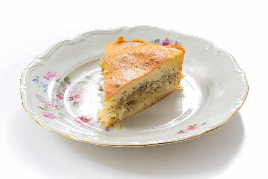 Перед началом готовки стоит подготовить все ингредиенты.Яйца отварить вкрутую, обдать холодной водой, очистить и нарезать кубиками.Капусту нашинковать. На сковороде растопить 25 г сливочного масла, обжарить капусту около 5 минут.Добавить примерно 0.5 стакана воды, накрыть крышкой и тушить на медленном огне в течение 10 минут до мягкости.Лук нарезать мелко и обжарить до золотистого цвета на оставшемся масле.Смешать капусту с луком и яицами, добавить пряности и укроп.Приготовление теста