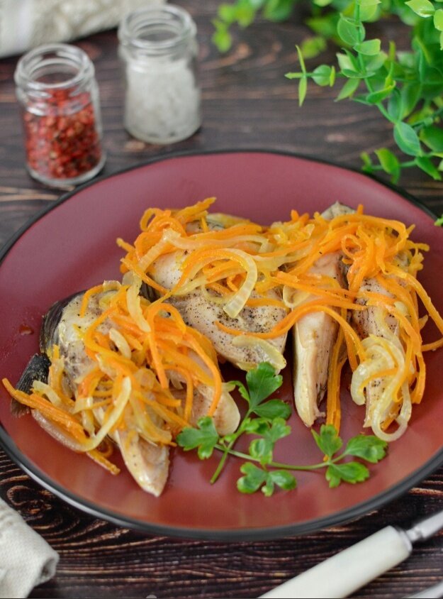 После этого скумбрию стоит промыть под холодной струей воды и обсушить с помощью бумажных полотенец. Затем можно переходить к овощам: очищенные лук и морковь тоже следует пром rinses.