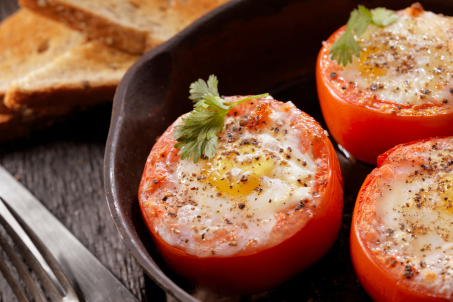 - Наполнить подготовленные помидоры начинкой и аккуратно поместить яйцо сверху.