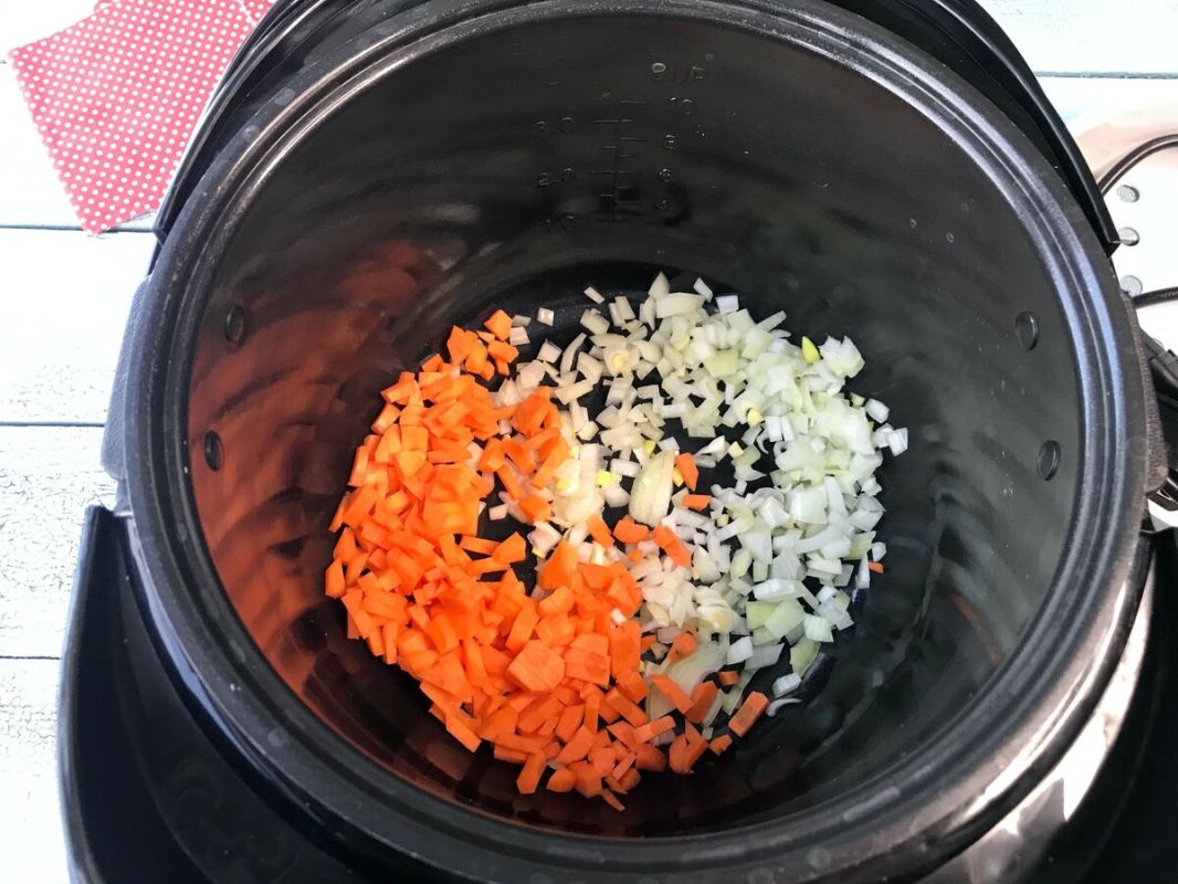 1. Начните с нарезки лука и моркови. Мелко нарежьте овощи, а затем на сковороде разогрейте растительное масло и обжарьте их до мягкости.