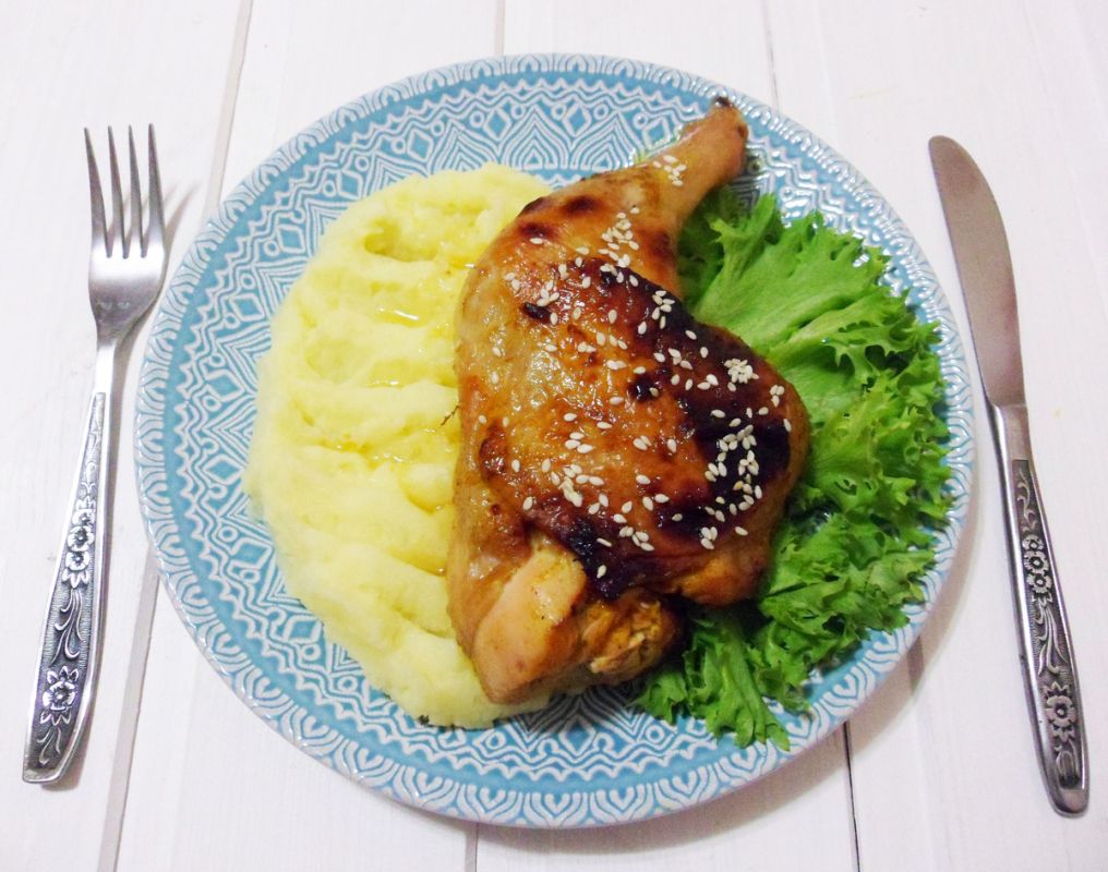 Перед запеканием духовой шкаф разогревается до 200°C. Куски курицы помещаются в жаропрочную форму, поливаются подготовленным маринадом и ставятся в духовку на 25 минут. По истечении времени курицу следует перевернуть и готовить еще 20-25 минут, проверяя готовность с помощью прокола в бедре; сок должен быть прозрачным.