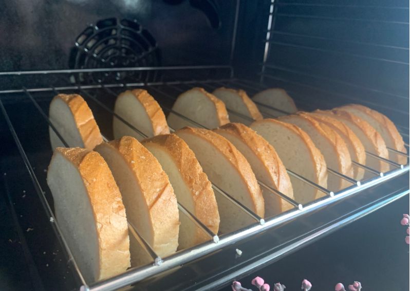 - Тосты на одной решетке. Если вам нужно подсушить несколько ломтиков хлеба, просто поставьте решетку в духовку, а противень под неё. Через 15 минут горячие тосты будут готовы!