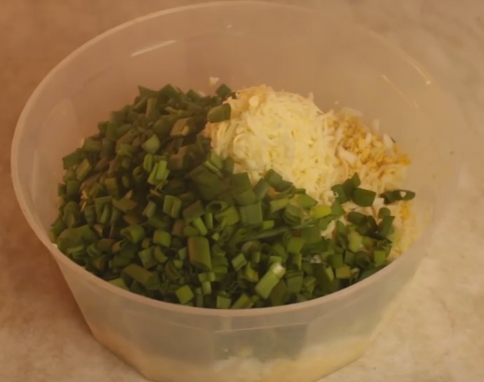 Опираясь на ингредиенты, можно создать быстросготовленную начинку. Яйца и сыр натираются на терке, а зеленый лук нарезается мелко. Все компоненты начинки смешиваются и слегка солятся по желанию.