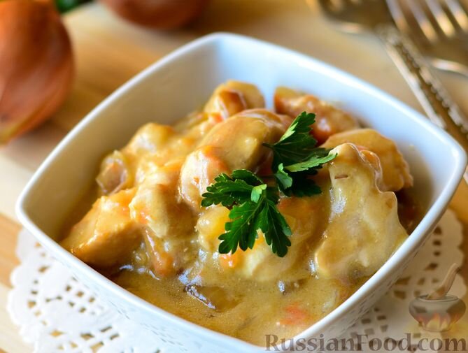 Ингредиенты: куриное филе, репчатый лук, морковь, сметана, мука, растительное масло, соль, молотый черный перец, зелень петрушки и вода.