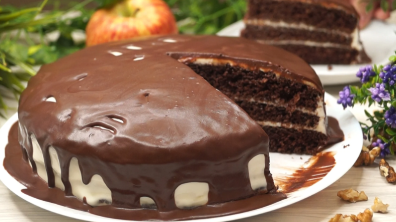 Дайте торту пропитаться в течение 2-3 часов при комнатной температуре, пока готовите глазурь: растопите шоколад с молоком на водяной бане. После остывания полейте торт глазурью.