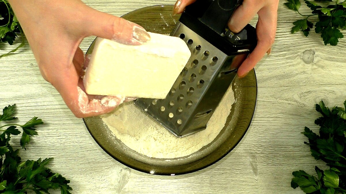 2. Замороженное сливочное масло натереть на крупной терке и добавить в мучную смесь. Быстро перемешать до состояния крошки — важно, чтобы масло не растаяло.