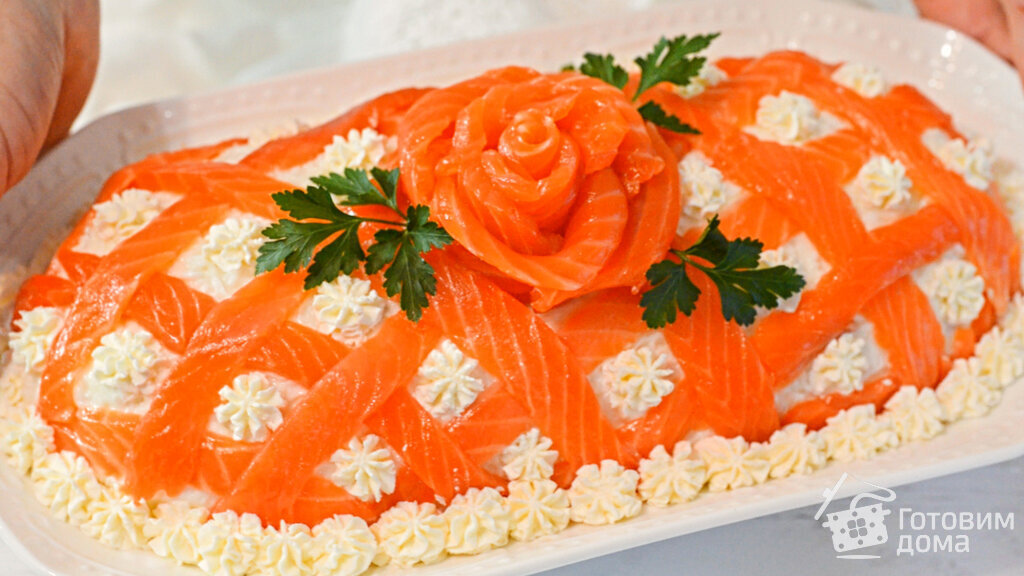 Для украшения нарежьте слабосоленую рыбу тонкими ломтиками и красиво оформите блюдо, добавив розочки из сливочного сыра.