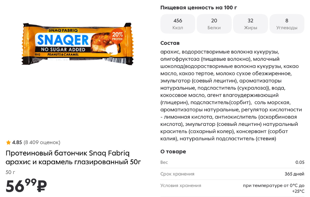 Рассмотрим состав популярного батончика Snaq Fabriq с вкусом «арахис-карамель» (вес 50 г):