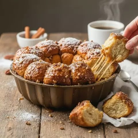 Выпечка и подача: После второго подъема десерт выпекается при температуре 180°C. После 35-45 минут выпечки его аккуратно переворачивают на сервировочную тарелку, чтобы ароматная карамельная заливка стекала по бокам. Обезьяний хлеб подают теплым, предлагая очищать его отламывая, как это делают обезьяны с бананами.