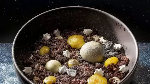 Следующий этап — блюдо, посвященное жизни на космической станции. В центре тарелки находится томленая говядина, окруженная нежным кремом сельдерея, создающим эффект орбиты. Морковный мусс искрится, как далекая звезда, а пыль сельдерея завершает красочную композию. Гвоздем программы становится интерактив с соусом демиглас на основе кваса, который гость может выдавить из металлического тюбика, погружаясь в атмосферу космического питания.