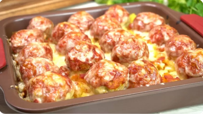 Когда на часах не хватает времени, а на ужин хочется чего-то по-настоящему сытного, этот рецепт станет настоящей находкой. Уникальная идея состоит в том, чтобы приготовить гарнир и основное блюдо в одной форме. Запеченный картофель становится невероятно насыщенным, а мясные шарики с томатной корочкой просто тают во рту.
