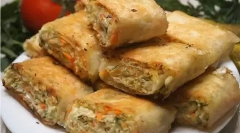 Следующий шаг — взять лист лаваша, равномерно распределить начинку, добавить немного майонеза и аккуратно свернуть в рулет. Нарезать на порционные кусочки, затем обжарить на сковороде с обеих сторон до золотистой корочки. Этот процесс займет всего пару минут, но результат поразит всех!