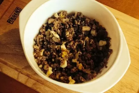 Сначала гречневую крупу нужно залить двумя стаканами воды, накрыть крышкой и поставить на сильный огонь. Как только вода закипит, добавьте соль по вкусу, убавьте огонь до минимума и закройте крышку. Дождитесь, когда вся вода впитается, после чего снимите с огня. Во время приготовления гречку не рекомендуется мешать!Параллельно отварите яйца вкрутую – на это уйдет около 7 минут после закипания.Мелко нарезанные лук и грибы обжарьте на сливочном масле с умеренным летом, чтобы масло не сгорело. По вкусу добавьте соль и перец.Когда грибы и лук будут готовы, добавьте их в гречку и аккуратно перемешайте.Порежьте вареные яйца и также включите в гречку, проведя финальное смешивание.Это простое, но очень вкусное блюдо станет отличным дополнением к вашему столу и порадует всех членов семьи. Приятного аппетита!