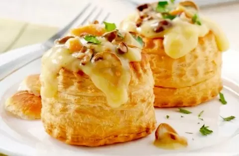 - Мини корзиночки из слоеного теста с сыром бри, клюквенным соусом и орехами. Идеально подойдут для завершения сырной тарелки или в качестве светлого аперитива.