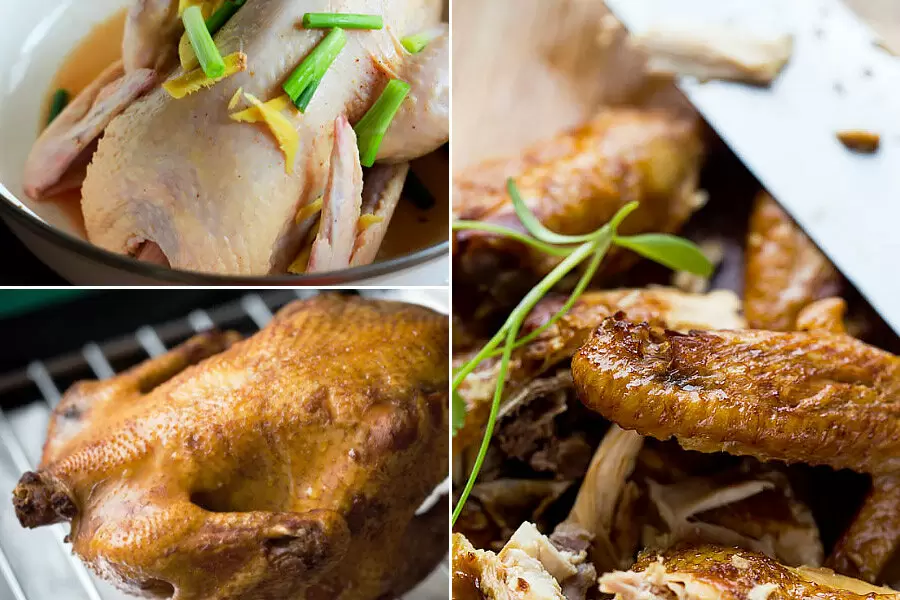 - После приготовления дайте курице остыть в бульоне. Затем достаньте ее, подсушите и запекайте в духовке, предварительно смазав медом с водой, около 15 минут при температуре 180°C.