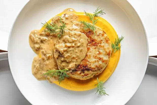 Оформите блюдо с помощью гарнирного кольца: выложите крем из моркови и сельдерея, на него аккуратно поместите щучью котлету, полейте грибным соусом и украсьте зеленью укропа. Приятного аппетита!
