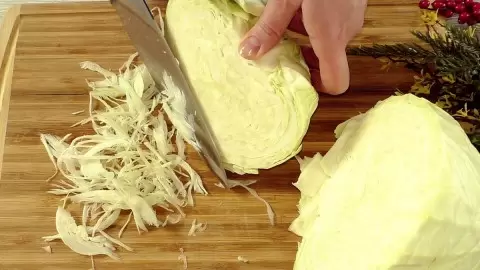 Начните с подготовки капусты: снимите верхние листья и нарежьте кочан на несколько частей для удобства. Затем нашинкуйте капусту соломкой и переложите в большую миску.