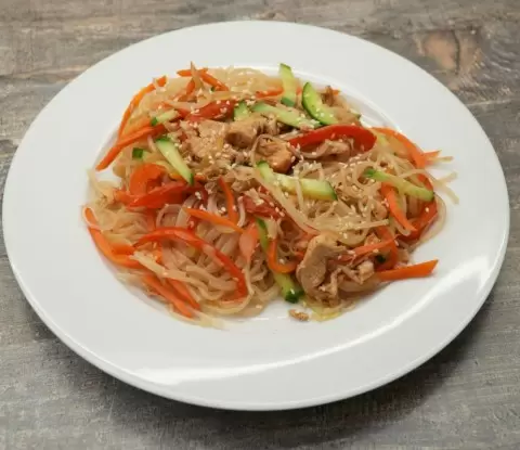 Фунчоза заливается кипятком и оставляется на 5–7 минут, затем сливается вода. Она должна стать мягкой, но не разваренной.