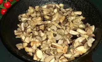 1. Сначала белые грибы необходимо очистить и нарезать, а затем обжарить на растительном масле в течение 5-7 минут, слегка приправив солью и перцем.