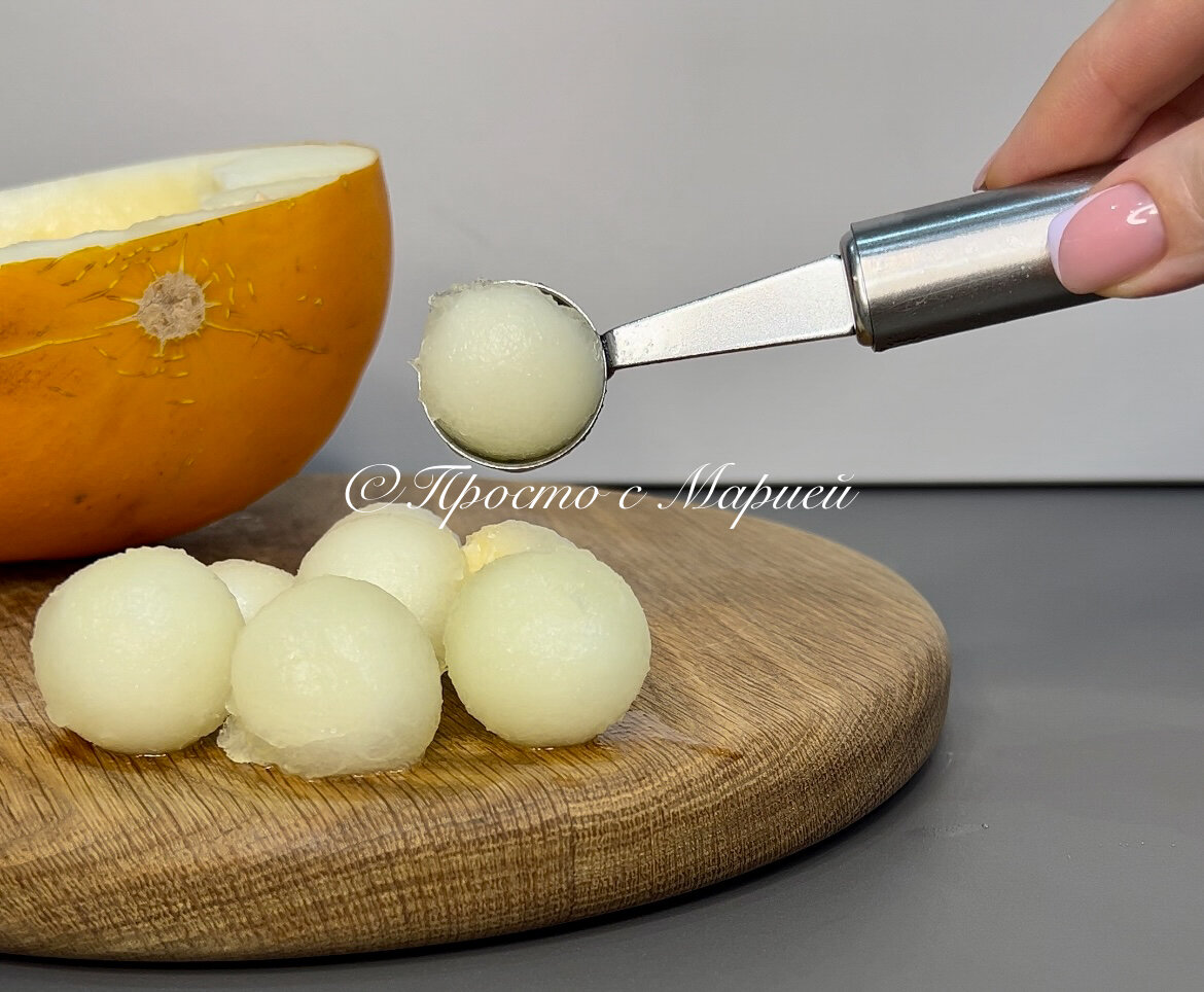 - Сочная дыня: выбирайте зрелые, сладкие плоды, нарезая их кубиками или оформляя в виде аккуратных шариков.