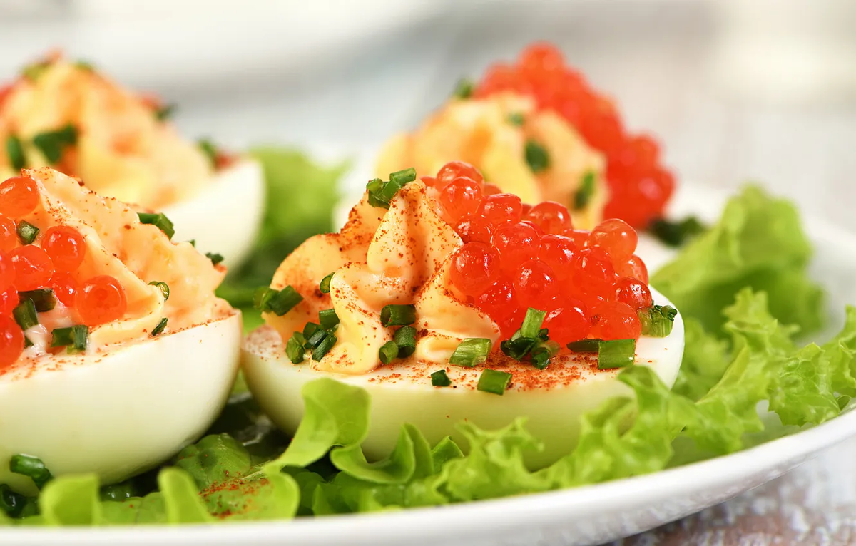 Яйца разрезаются пополам, желтки смешиваются с майонезом и аккуратно возвращаются обратно. Сверху помещаются ложки икры и нарезанная зелень.